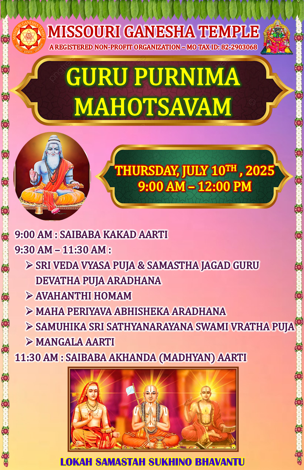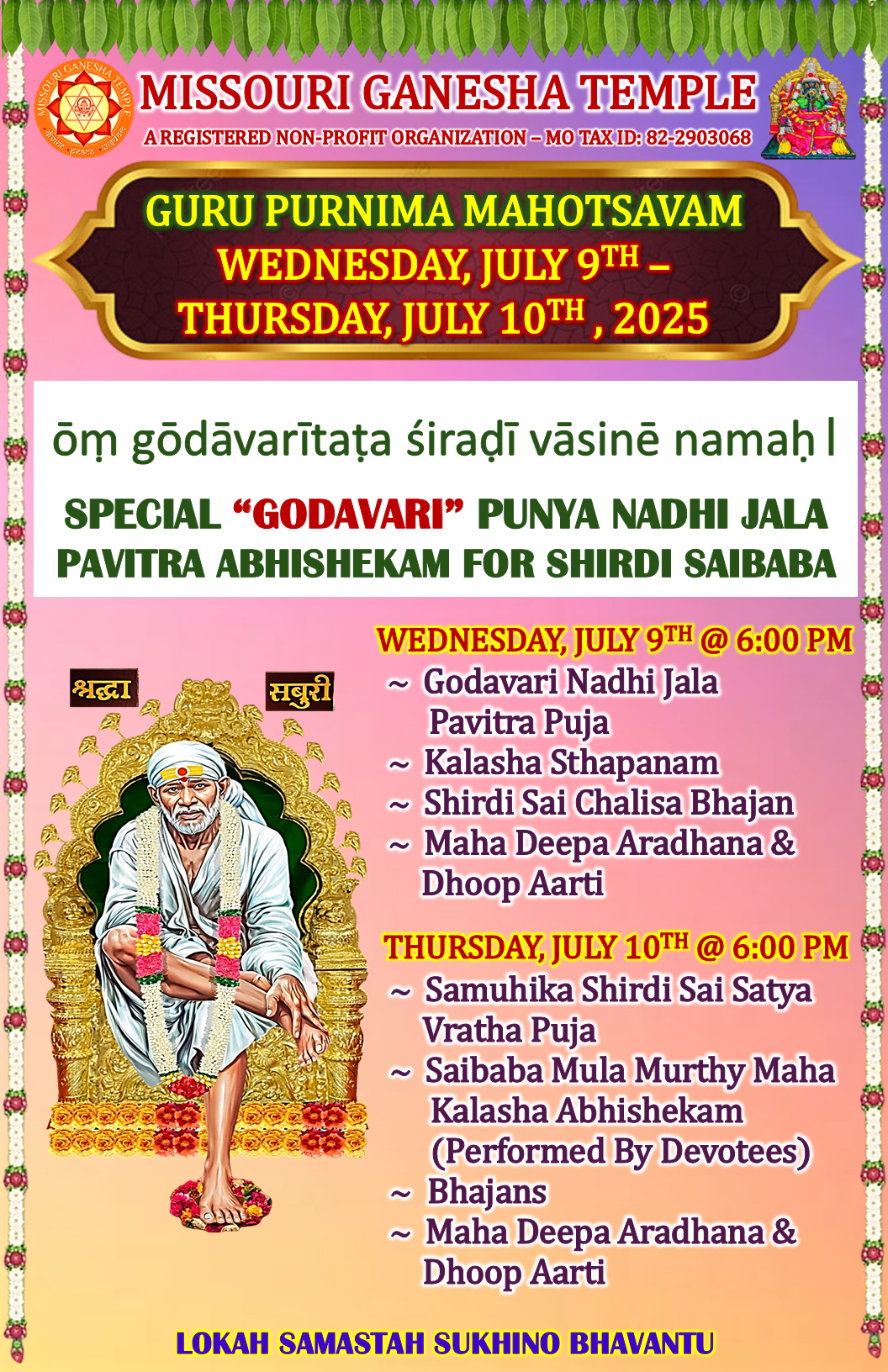 | Options | SATYANARAYANA PUJA SANKALPAM: $25, SATYANARAYANA PUJA – IN PERSON: $51, GODAVARI JALA PAVITRA PUJA SANKALPAM: $51, SAI SATYA VRATHA PUJA: $51, SHIRDI SAI MULA MURTHY ABHISHEKAM: $116, SARVA SEVA / WHOLE EVENT: $251 |