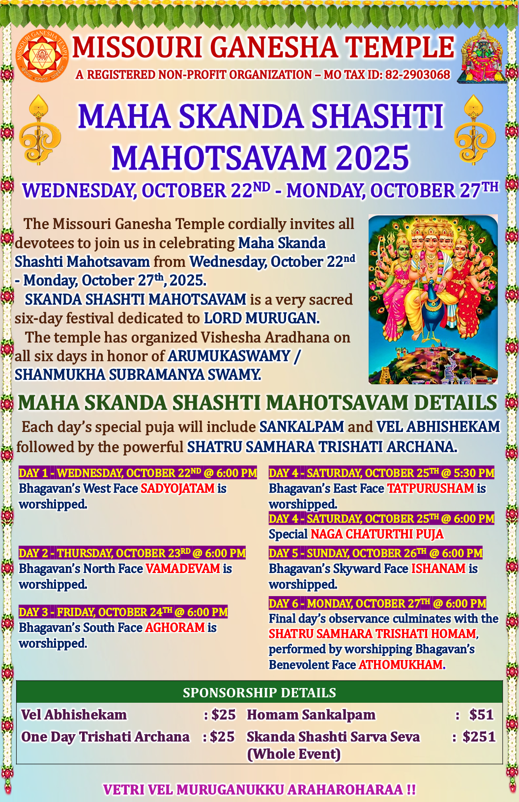 | Var | Vel Abhishekam – $25, One Day Trishati Archana – $25, Homam Sankalpam – $51, Skanda Shashti Sarva Seva (Whole Event) – $251 |