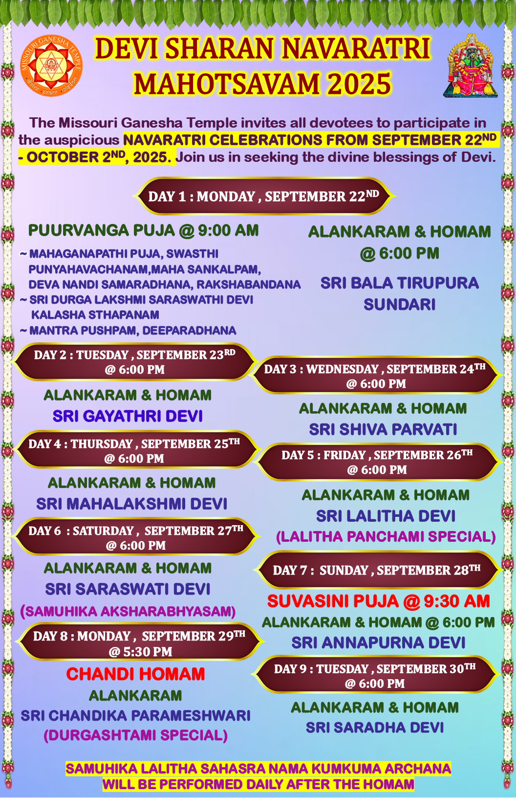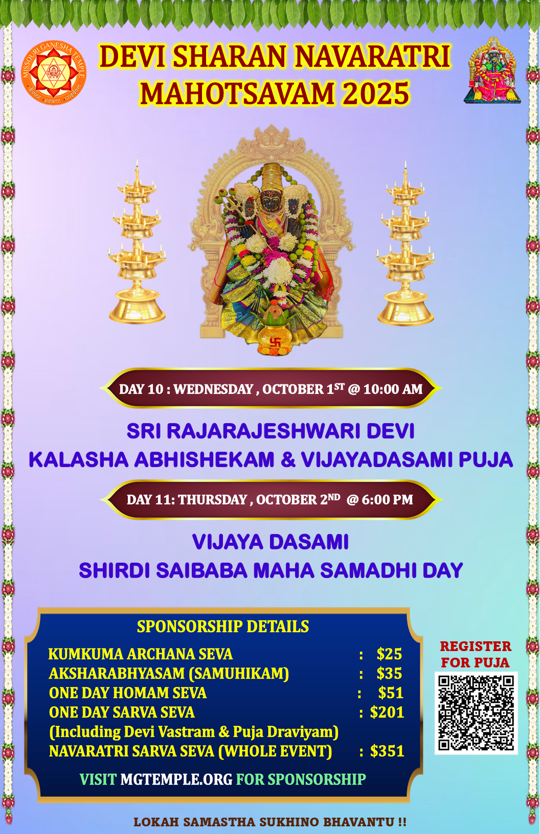 KUMKUMARCHANA SEVA: $25, AKSHARABHYASAM (SAMUHIKAM) – $35, ONE DAY HOMAM SEVA – $51, ONE DAY SARVA SEVA – $201, NAVARATRI SARVA SEVA (WHOLE EVENT) – $351