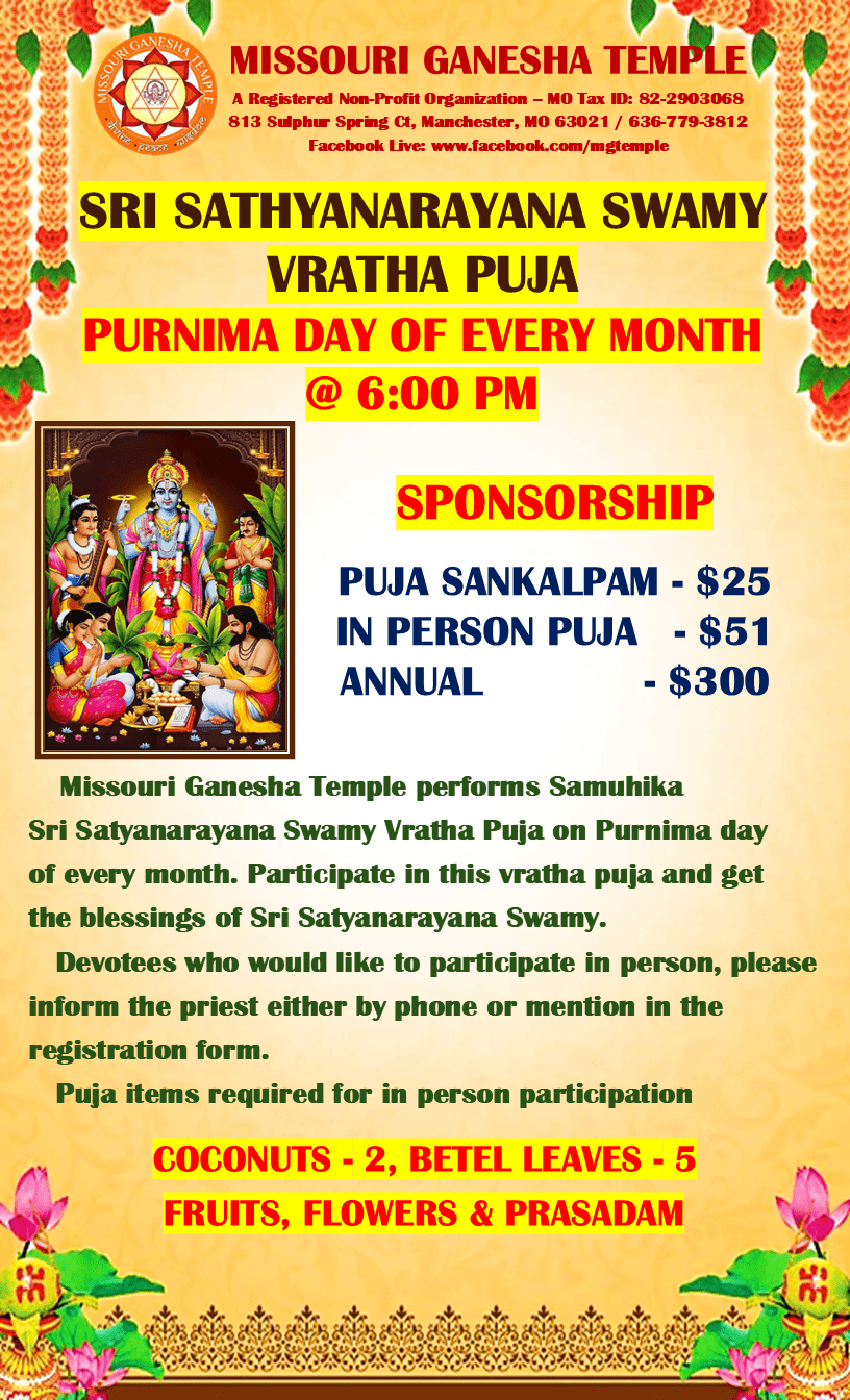 Puja Sankalpam – $25, Samuhika Puja – $51, Annual – $300