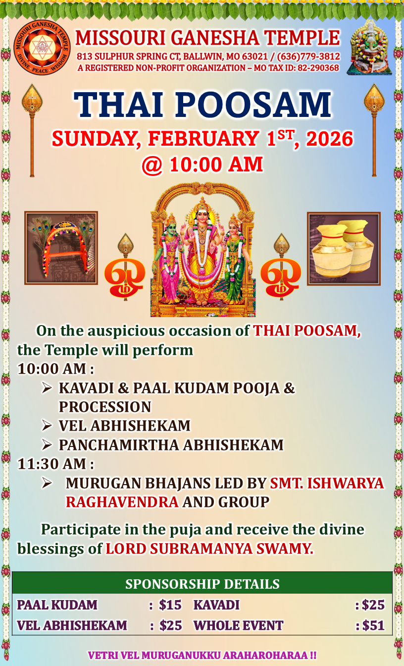 Paal Kudam – $15, Vel Abhishekam – $25, Kavadi – $25, Whole Event – $51