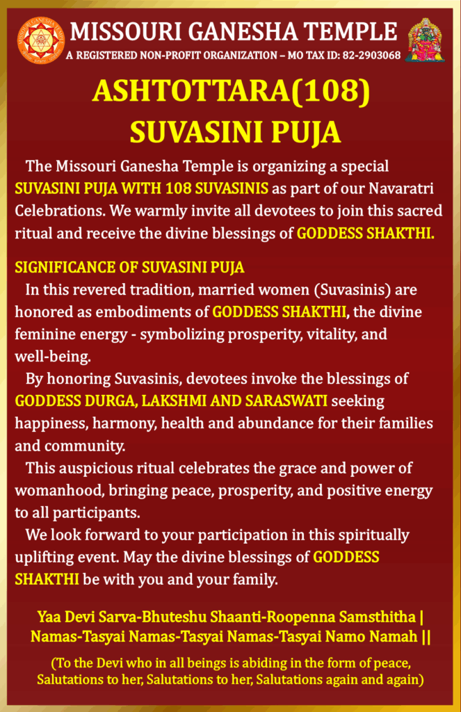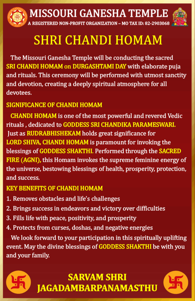 During the Navarathiri Utsavam at the Missouri Ganesha Temple, each day will be focused on worshiping a different form of Devi through homam and pooja. As part of these celebrations, the daily ritual of Lalitha Sahasranamam Kumkuma Archana will be performed to honor the Goddess. The culmination of observing these rituals throughout Navarathiri brings blessings on the final day, Vijayadasami, which signifies success. To mark this, a Chandi Homam will be performed at MGT to emphasize the triumph of good over evil, and Suvasini Puja with 108 Suvasini’s !